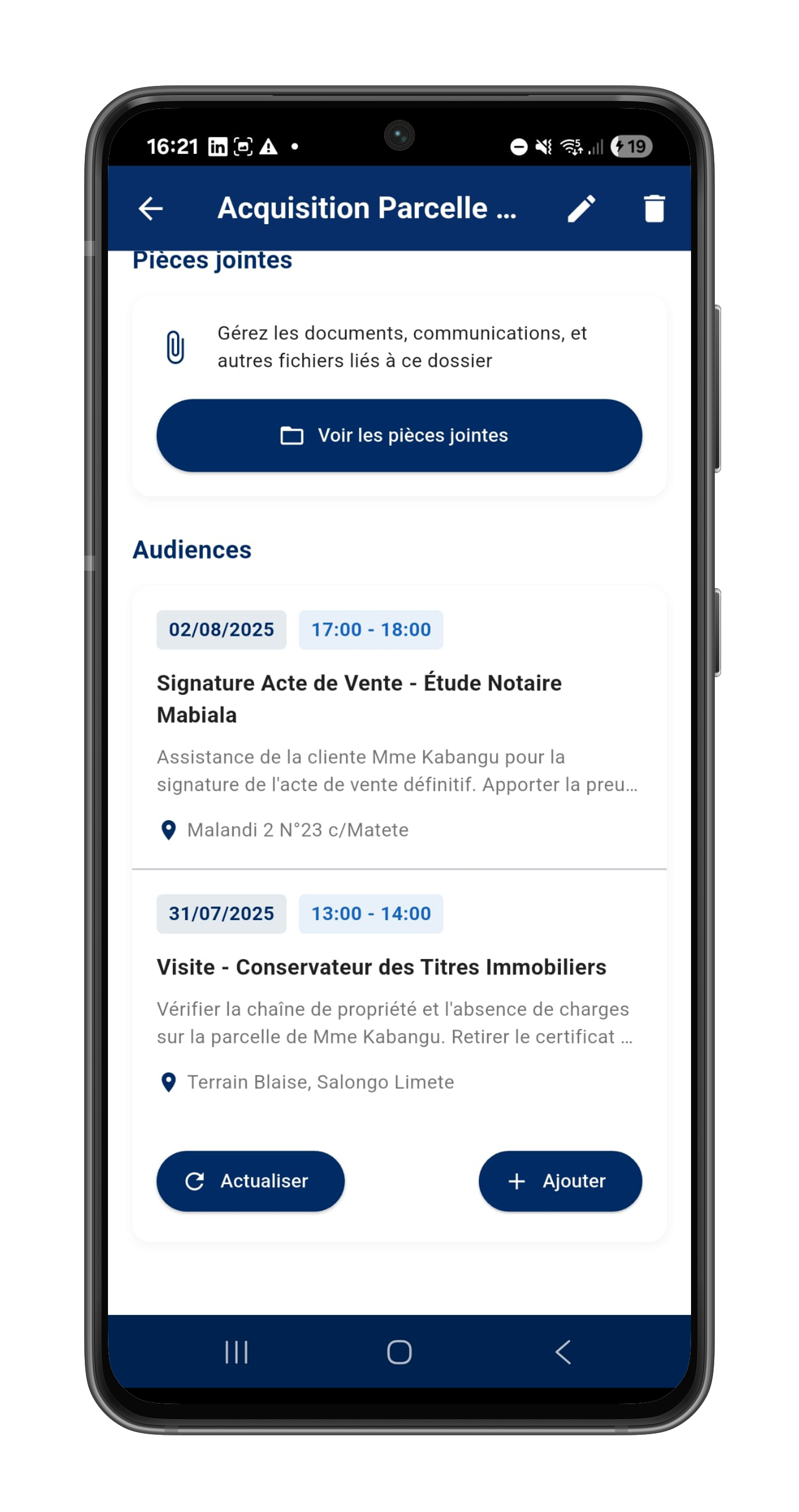 Gérez efficacement votre calendrier d'audiences avec des fonctionnalités de planification, de rappels et de prise de notes. L'application vous permet de filtrer les audiences par date ou par dossier, assurant que vous ne manquerez jamais une comparution importante.