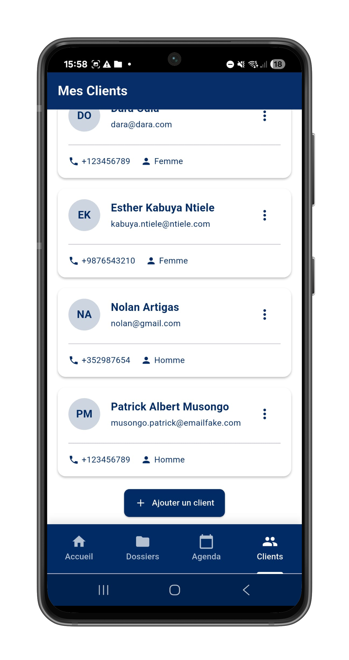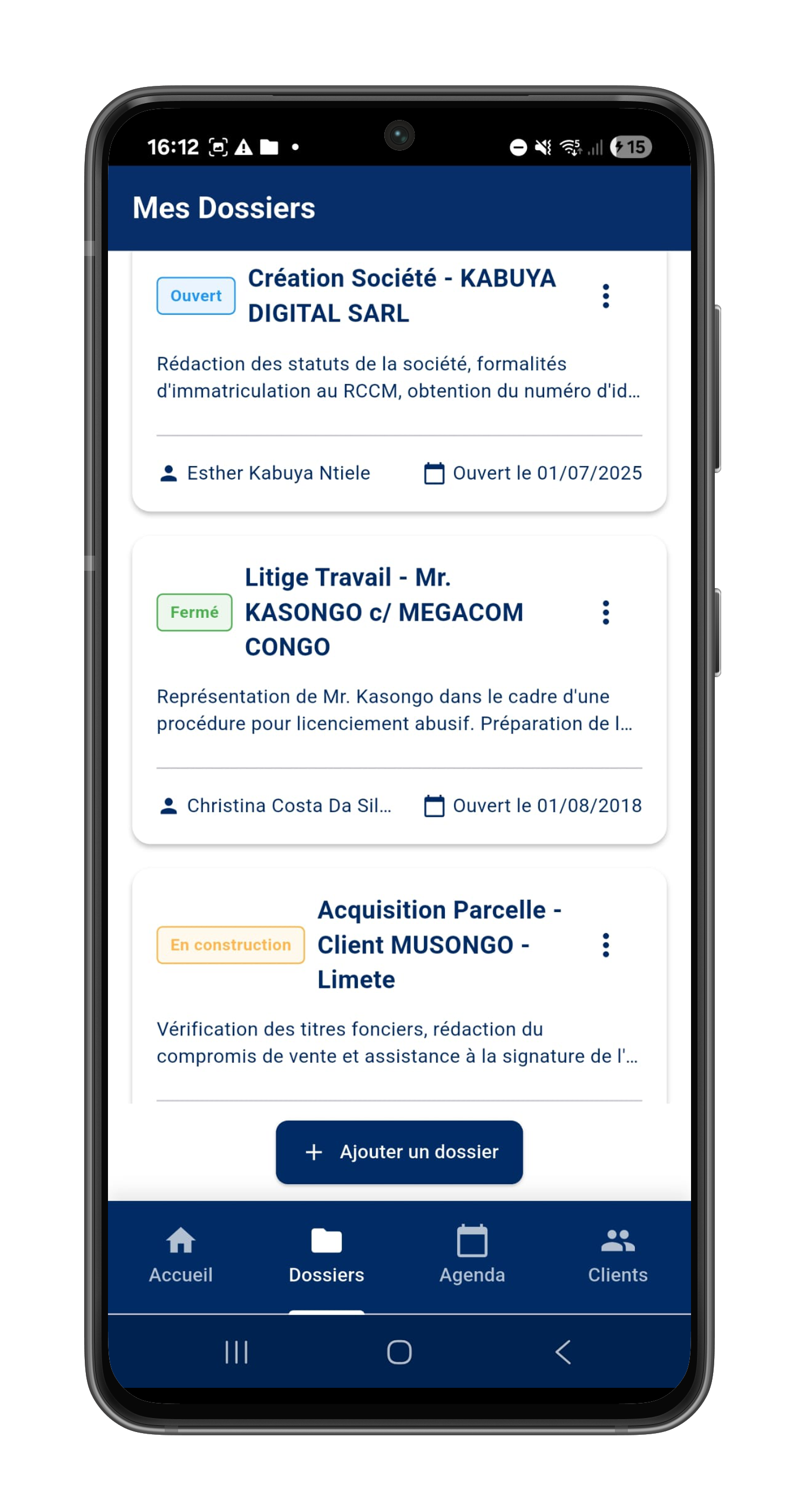 L'application permet de créer, consulter, modifier et supprimer des dossiers juridiques. Chaque dossier peut être associé à un client spécifique, facilitant ainsi l'organisation et le suivi de votre travail.